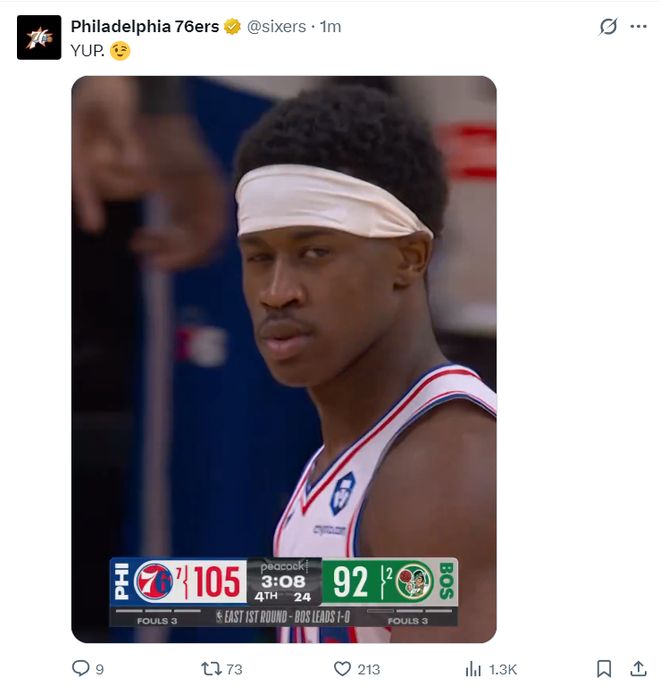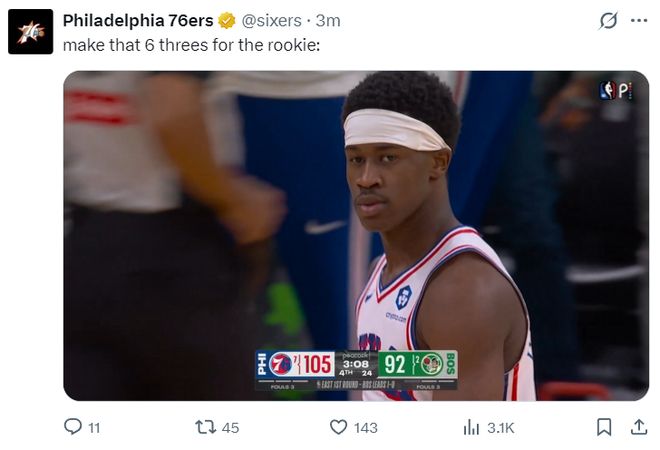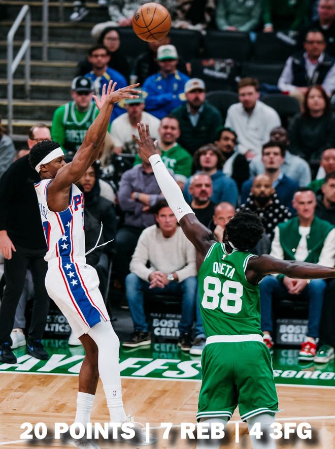 埃奇库姆在第四节命中第六个三分球时已经帮助费城拉开到13分,绿凯主场死气沉沉没有任何的加油声,因为球迷知道这场比赛交代了。埃奇库姆这位新秀完成了一个王之蔑视。