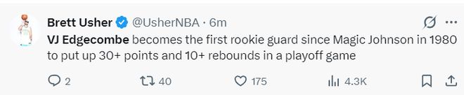 这场比赛VJ迎来生涯之夜,这是他生涯第二场季后赛,他就拿到30+的数据,他直接登上了全美热搜。