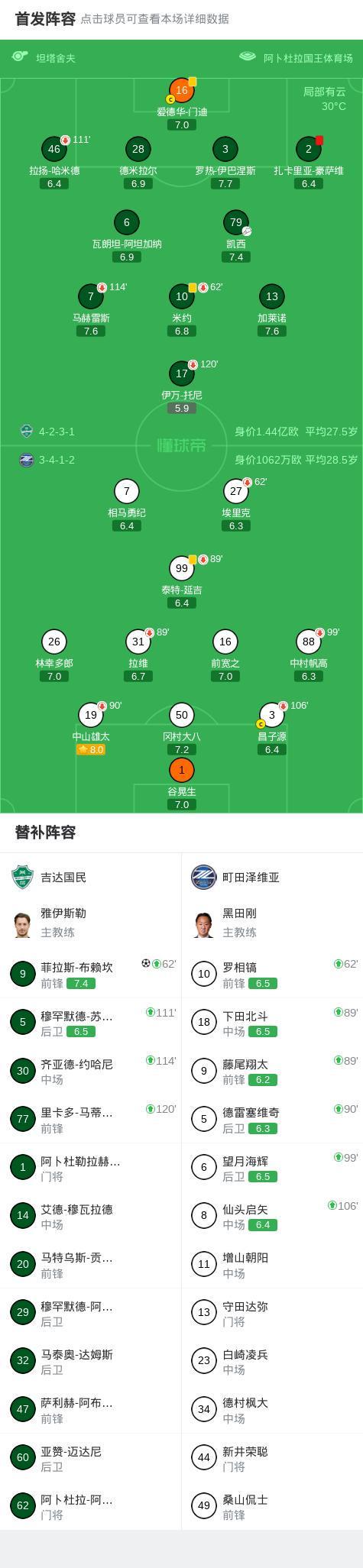 第96分钟,凯西助攻,布赖坎进球打破僵局,吉达国民1-0町田泽维亚